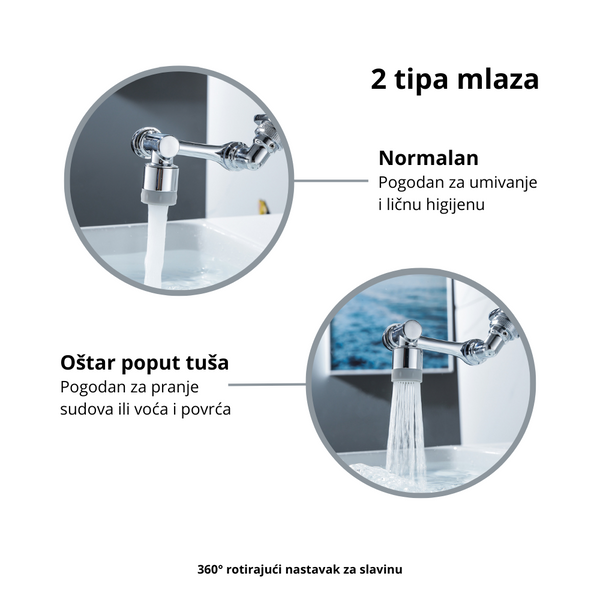 Uz pomoć nastavka je moguće podešavati i tip mlaza vode. Na samom kraju se nalazi plastični prsten, čijim okretanjem birate između dva tipa mlaza. Prvi tip je oštar poput tuša i pogodan je za pranje i ispiranje sudova kao i pranje voća i povrća, dok je drugi tip dosta sporiji i prijatniji pa je samim tim pogodan za umivanje i ličnu higijenu.