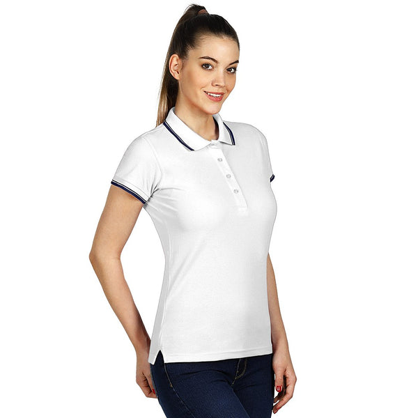 Ženska polo majica, 180 g/m2, blago strukirana, šivena sa strane, dupli štepovi na dnu i oko pazuha, ranfle oko rukava, četiri dugmeta u boji majice, rezervno dugme, ojačana trakom duž vrata i dodatnim štepom duž ramena, šlicevi sa strane