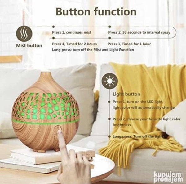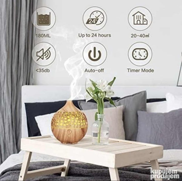 Karakteristike :  Tišina: buka <35 db omogućava vam da spavate mirno.  4 režima magle: kontinuirana magla 30 sekundi za interval prskanja vremenski za 1 sat vremenski za 2 sataSvetla u 7 boja: bela roze crvena ljubičasta plava zelena žuta. Svaka boja ima dva režima osvetljenja (tamno i svetlo). Sjajan poklon: Ovaj difuzor eteričnog ulja za aromaterapiju je divan poklon od kojeg svako može imati koristi. Savršeno za SPA jogu spavaću sobu sobu za bebe kancelariju dnevnu sobu kupatilo kancelariju konferencijsku salu itd.
