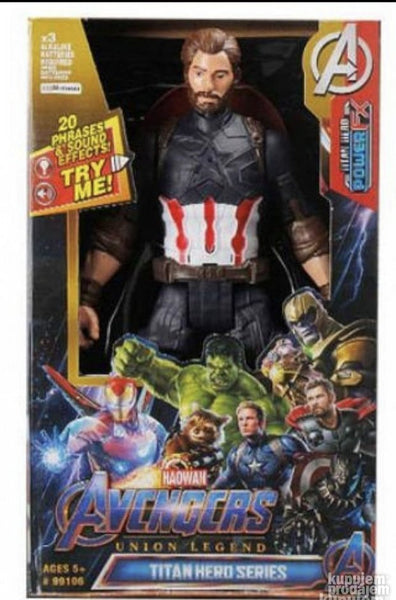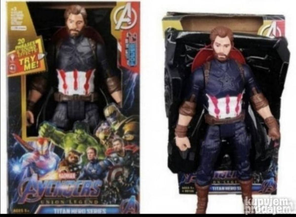 Kapetan amerika igračka sa zvučnim efektima će oduševiti Vašeg malog kapetana ! Akcioni junaci su omiljeni kod dečaka a K. Amerika lutka koja govori je savršen poklon za svaku priliku. Ova Kapetan amrika figura je napravljena od kvalitetne plastike i pritiskom na dugme izgovara neku frazu. Sjajno napravljena igračka za dečake. Baterije uključene. Visina igračke je 30cm.