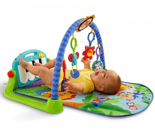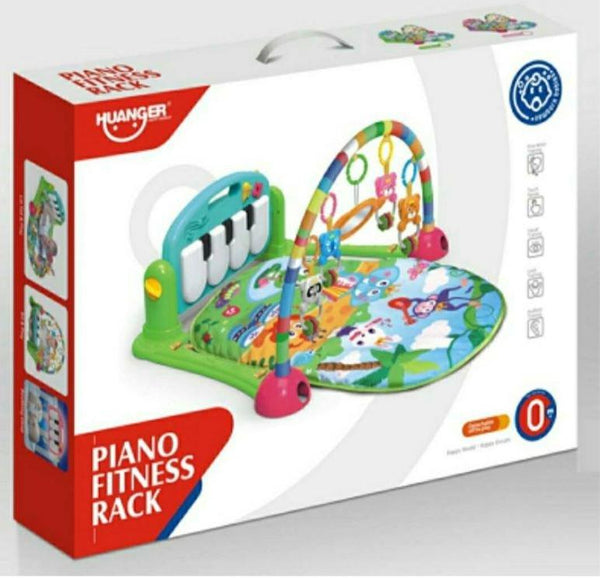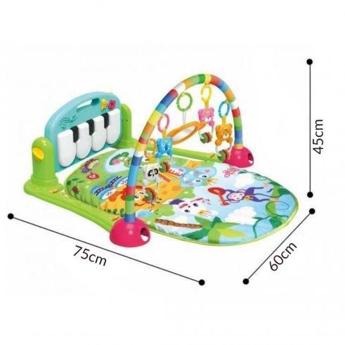 Multifunkcionalna muzička fitnes bebi gimnastika za igru uključuje muzički piano, bebi ogledalo za samoupoznavanje i 4 šarene igračke sa prstenovima koje vise na postolju.