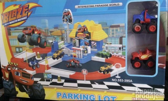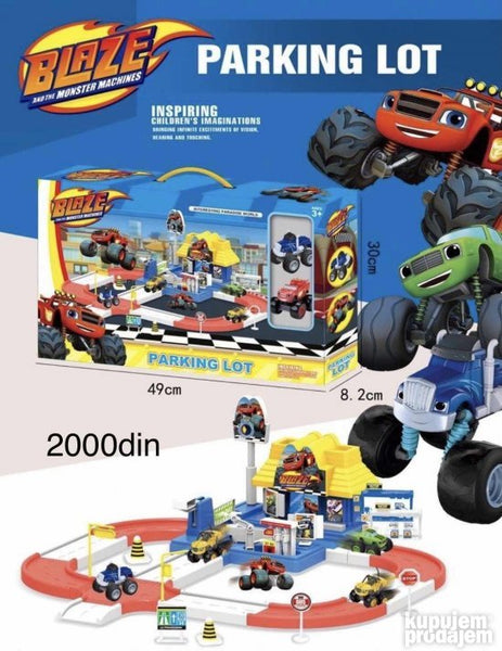 Blejz (Blaze) garaza. Uz set dobijate pratece elemente za montiranje znakove nalepnice kao i dva Blaze vozila. Set se brzo i lako montira.