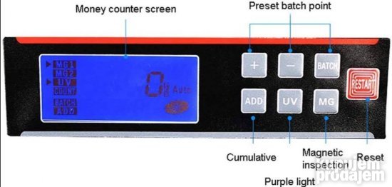Podržane valute: UV / MG: USD EUR GBP Argentina Brazil hongkonški dolar Venecuela Tanzanija Indija i druge magnetne valute UV: Japan Južna Koreja Mjanmar Vijetnam Rumunija Bangladeš Kanada i drugi plastični novčići ili valute koje nisu magnetne Specifikacija: Napon: 100-240V 50 / 60HZ Veličina mašine: 285 k 262 k 195 MM Brzina brojanja: 1000 kom / min Težina: 7 kg Unapred podešeni opseg: 1 ~ 999 Opseg brojanja: 0 ~ 9999 Ulazni kapacitet : 100PCS Kapacitet prijema novca: 100PCS
