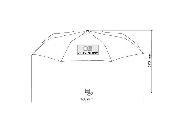 Kišobran sa 6 panela, plastična drška, metalni mehanizam za otvaranje, metalni stub (Ø 9 mm) i vrhovi, navlaka u boji kišobrana