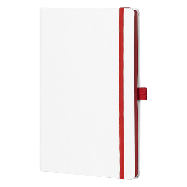 Notes sa zaobljenim ivicama, bojenom ivicom knjižnog bloka u boji elastične trake, bojenim predlistom u boji elastične trake, elastičnom trakom i držačem za olovku