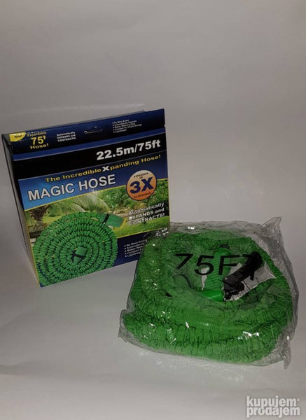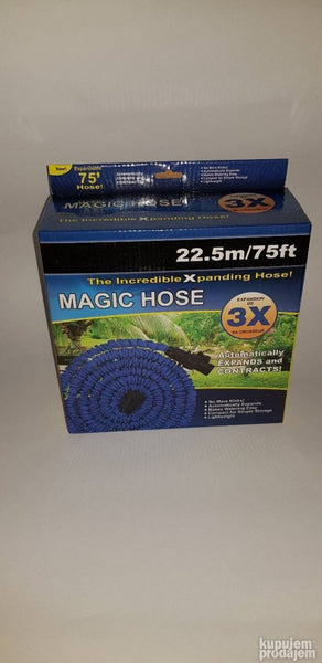 Magično rastegljivo bastensko crevo za zalivanje duzine 22.5m pod pritiskom vode. Kada se voda ispusti iz creva crevo se automatski skuplja na duzinu od 12.5m i veoma je lako za skladistenje jer ne zauzima puno prostora.