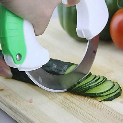Ovaj nož koristi kružnu oštricu koja se proteže duž celog obima ručke, omogućujući vam da ga kotrljate po dasci za rezanje poput igračke.