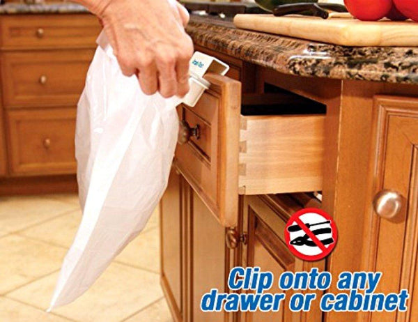 Fantastičan izum koji će Vam olakšati život. Reč je o prenosivom držaču kesa koji možete koristiti bilo gde u kući ili u dvorištu. Stavite ga u kuhinju, sa unutrašnje strane kuhinjskog elementa i koristite ga kao kantu za đubre. Ili sa spoljne strane elementa da Vam bude pri ruci za otpadke dok pripremate ručak. Takođe Vam može poslužiti kao skladište za razne namirnice, voće ili povrće. Držač možete koristiti i u kupatilu, na terasi, u garaži ili na bilo kom drugom mestu. Sastoji se iz 3 dela, deo koji se kači na vrata, uložak koji ide nakon što se stavi kesa i na kraju poklopac. Vrlo lako se montira, ima spojnice sa zadnje strane koje se pričvršćuju na bilo koju ladicu ili na vrata sa jakim podupiračem. Koriste se standardne vreće. Može se prati u mašini za sudove. Izrađen je od kvalitetne i čvrste plastike.