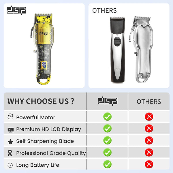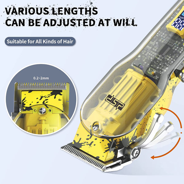 DSP mašinica zadovoljava sve Vaše potrebe prilikom brijanja i šišanja. Ova svestrana mašina za šišanje sa polugom za podešavanje uključuje 4 češlja za ograničenje boje (3mm, 6mm, 10mm, 13mm), koji kombinuju funkcije mašine za šišanje i trimera za bradu u jednoj mašini. Može zadovoljiti vaše potrebe za šišanjem glave i lica, a istovremeno je pogodan za kožu. Ova profesionalna mašina za šišanje ima snažan motor od 8 V sa brzinom od 5800 obrtaja u minuti, odličnim performansama i dugim vekom trajanja, koji može da obezbedi oštre i efikasne rezove.