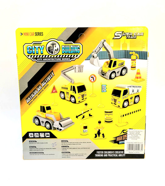 Set gradiliste napravljen od cvrste i kvalitetne plastike, sadrzi pet gradjevinskih vozila, dva gradjevinca, cetiri prateca elementa koja se mogu naci na svakom gradilistu. Ovim setom igracaka dete razvija mastu, koordinaciju ruku kao i spretnost i motoriku. Dimenzije seta su 21cm x 18cm x 4cm. Namenjen je uzrastu 3+.