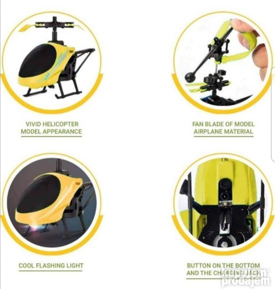 Helikopter za decu koji leti do 5 m u visinu pritiskom na dugme pokreću se elise takođe može leteti pomocu daljinskog i moze da lebdi iznad ruke ili najviše do 5 m iznad nje baterije su punjive i jednostavno se pune putem USB kabla vreme leta od 7 do 10 minuta vreme punjenja helikoptera do 30 minuta