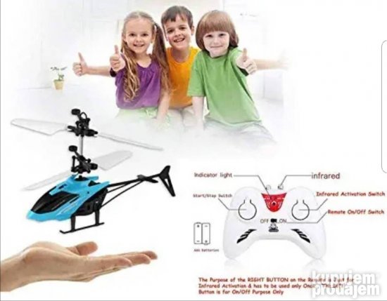 Helikopter za decu koji leti do 5 m u visinu pritiskom na dugme pokreću se elise takođe može leteti pomocu daljinskog i moze da lebdi iznad ruke ili najviše do 5 m iznad nje baterije su punjive i jednostavno se pune putem USB kabla vreme leta od 7 do 10 minuta vreme punjenja helikoptera do 30 minuta