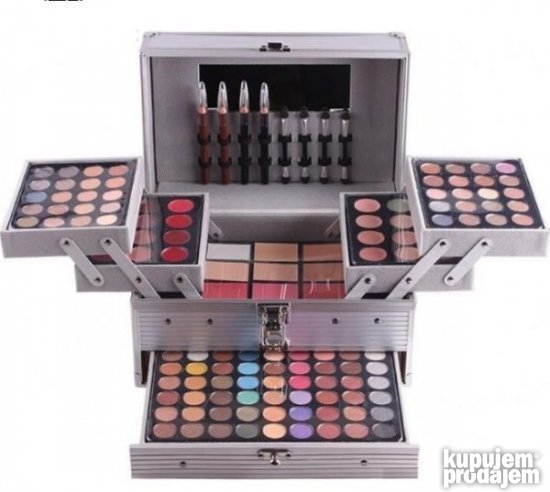 Komplet kofer sa sminkom odlican kvalitet sminke. Visoko kvalitetna šminka za profesionalnu upotrebu na jednom mestu. Kofer sadrži: - 95 senki za oči - 15 korektora - 15 ruževa za usne - 5 senki za obrve - 5 hajlajtera - 5 rumenila - 5 pudera sa visokom pokrivnom moći