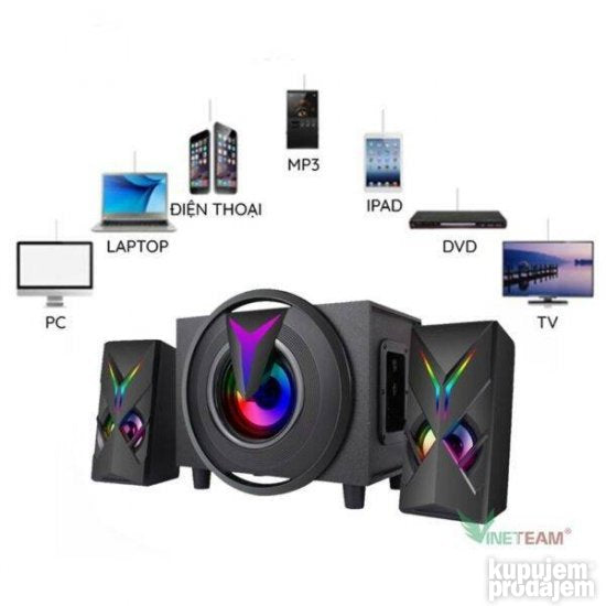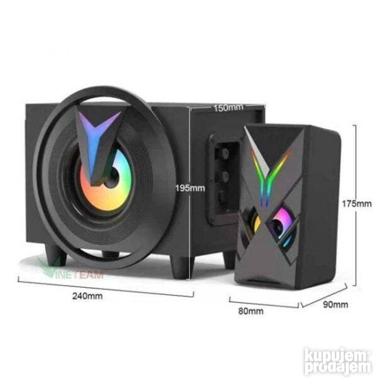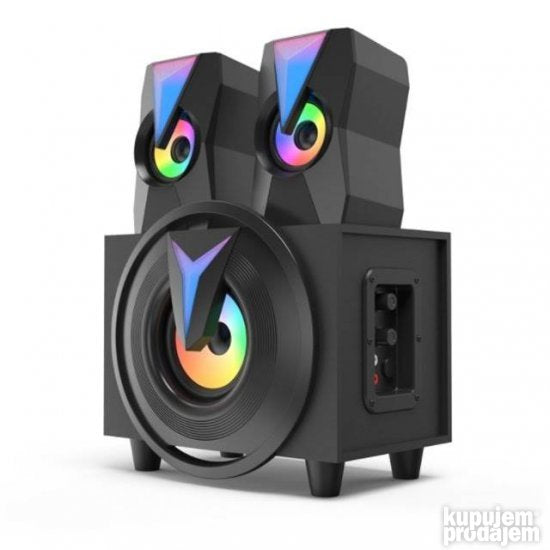 K10-9005BT ima ugao moderan elegantan dizajn sa zadivljujućim RGB LED diodama. Zvučnici će biti veoma istaknuti pored ekrana računara na TV ormaru ili na pultu u malim kafićima.
