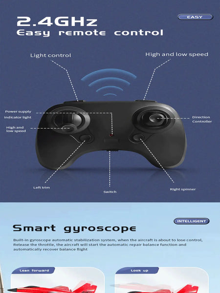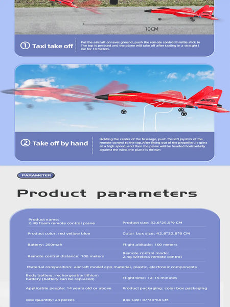 HW33 RC Avion sa fiksnim krilima, napravljen od EPP pene, sa 6-osnim žiroskopom, LED svetlima i 2.4 GHz frekvencijom. Dizajniran je kao model aviona otporan na padove i dostupan je u crvenoj boji.