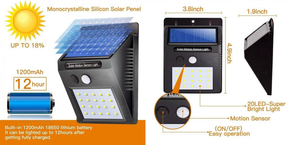Bez instalacija i komplikacija. Samo izvadite lampu iz kutije i postavite je gde god želite. Pružaju jako osvetljenje za široko područje, koje je mnogo svetlije od drugih sličnih solarnih svetla. Spoljnja upotreba (stepeniste, garaže, terase, vrtovi. ) Solarna Led Lampa Sa Senzorom Pokreta I Led Svetlom. Pružaju jako osvetljenje za široko područje, koje je mnogo svetlije od drugih sličnih solarnih svetla. Više od 8 sati vremena osvetljenja nakon 8 sati napunjenih pod idealnom jarkom sunčevom svetlošću. Vodootporni nivoi solarnih sigurnosnih lampica a solarni paneli otporni i na toplotu. Zbog toga mogu izdržati svakodnevnu upotrebu bilo da je sunčano, kišno, vruće ili mraz. Spoljna svetla su pogodna za ormare, stepenice, terasu baštu, vrt, dvorište, stazu, stepenice, ou, garažu, bazen.