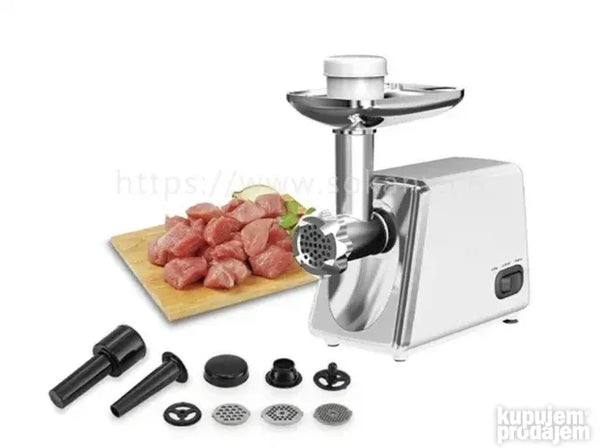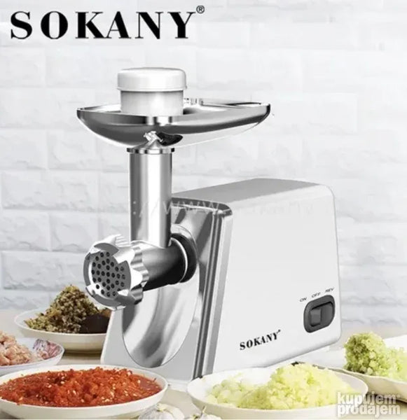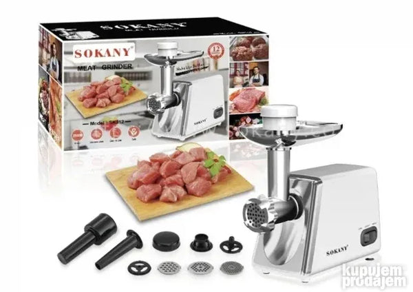 proizvodu Električna mašina za mlevenje mesa SOKANI SK-312 Maksimalna snaga: 2500 V Nizak nivo buke: 80 dB Produktivnost: 27 kg/min Reverzna funkcija Metalni pogon čahure 3 diska za mlevenje: veliki 7mm srednji (5mm) mali (3mm) Mlaznica za punjenje kobasica Mlaznica Kebbe metalni poslužavnik Potiskač za hranu sa odeljkom za skladištenje mlaznica za kobasice Odeljak u kućištu za odlaganje diskova Materijal kućišta - ABS plastika Dugme za vađenje mlaznica Gumirane neklizajuće nožice Dužina kabla: 1 m Napajanje: 220-240 V 50-60 Hz