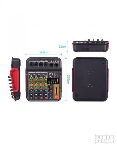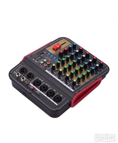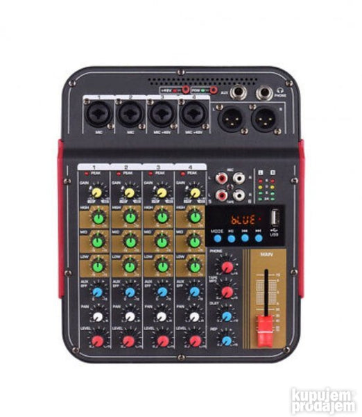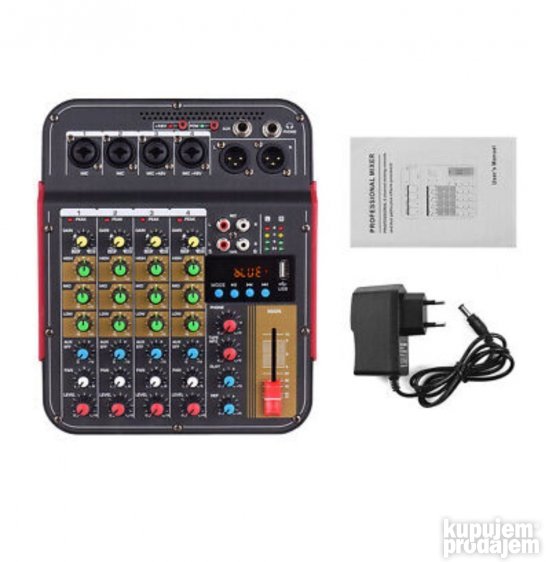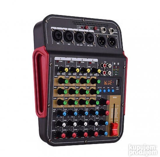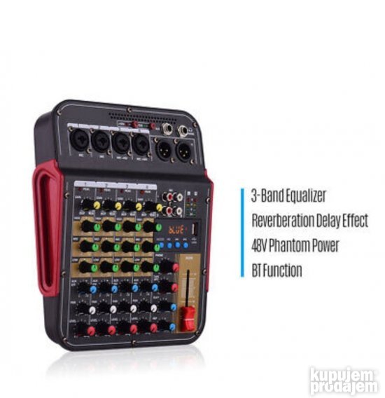 Opis DM4 6-kanalni audio mikser DJ dildo sa 48V Phantom Bluetooth USB reprodukcijom snimanja na računar za karaoke zabave uživo. Ovo je 6-kanalni multifunkcionalni mikser sa zvučnom karticom. Može da ispuni mnoge zahteve korisnika kao što su kućna muzička produkcija prenos uživo obrada K pesme itd. karakteristika: 1. Sa 4 mono kanalna ulaza (kombinovani mikrofon i linija) i 1 stereo RCA ulaz 1 L &R linijski ulaz 2. Sa Phontom napajanjem +48V pogodan je za napajanje kondenzatorskog mikrofona. 3. Pojačanje 3 opsega EK 1 Auk i FKS 1 pan za svaki kanal 4. Sa USB ulazom sa Bluetooth funkcijom 5. Sa odlaganjem i efektom ponavljanja 6. Mikser kompaktan lagan može se direktno povezati na USB port računara. 7. Sa izlazom za slušalice visoke rezolucije MP3 programi i uređaji sa jednom zvučnom karticom mogu se koristiti kao PC veza. 8. Može se napajati za eksterne baterije adaptere i računare.