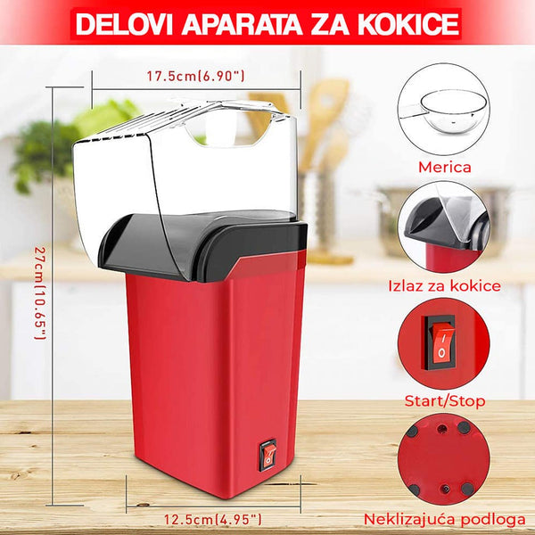 Aparat za kokice radi na bazi vrelog vazduha koji cirkuliše. Nisu potrebni ulje li bilo kakve nezdrave supstance.