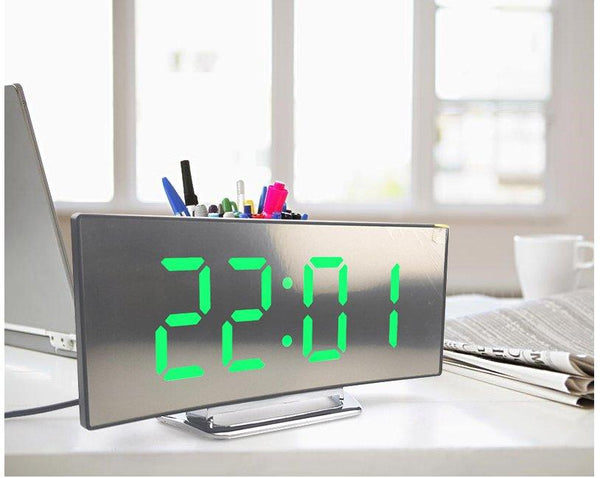Moderan sat sa ogledalom, alarmom, funkcijom odlaganja, prikazom temperature i podesivom osvetljenoscu ekrana sa prigusenim svetlom tokom noci.
