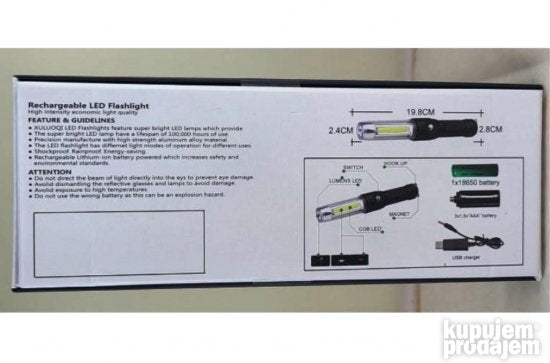 Mutifunkcionalna punjiva lampa Duzine 19.8cm Lampa ima vise modela rada na zadnjoj strani ima I magnet I deo za kacenje za pojas U kompletu dobijate Lampu USB kabal 18650 punjivu litijumjonsku bateriju punjac za bateriju=======