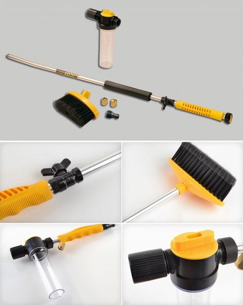 • Set sadrži: Mlaznicu za baštensko crevo, Četke za čišćenje, Rezervoar za sredstvo za čiščenje, 2 Mlaznice (da stvore pritisak razlićitih radijusa)