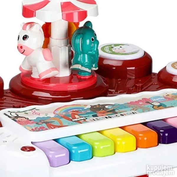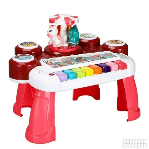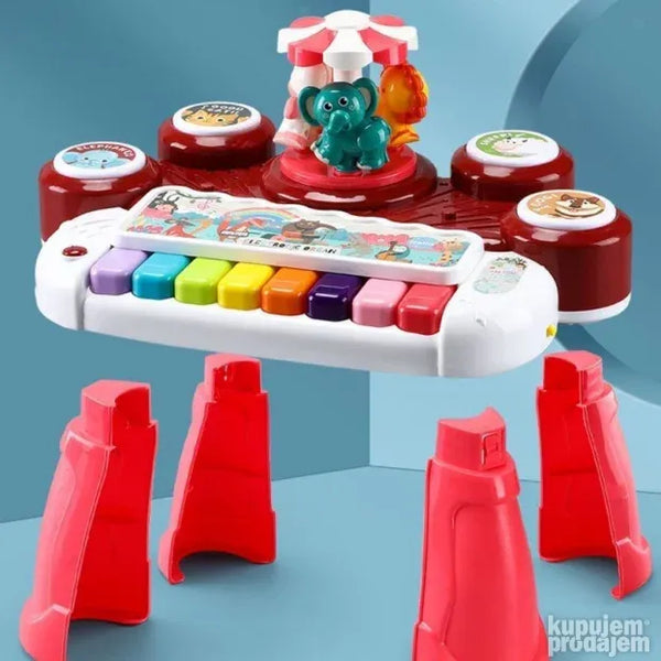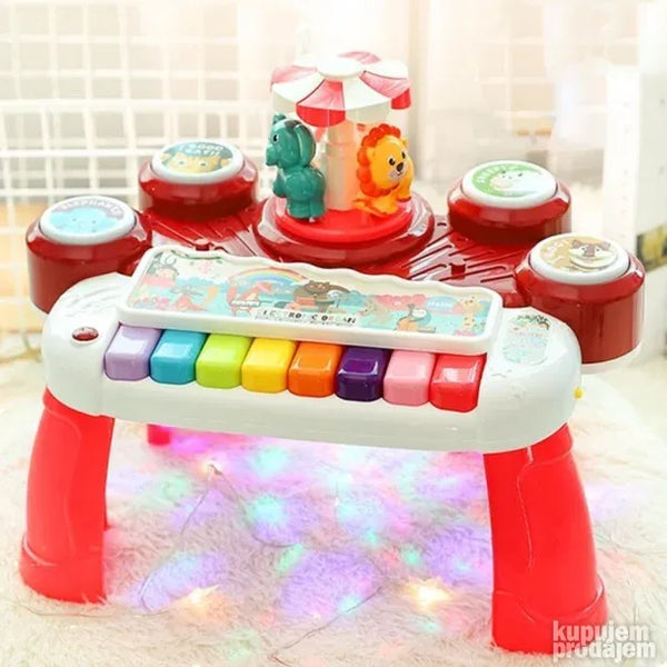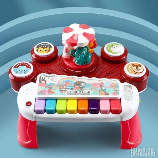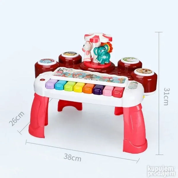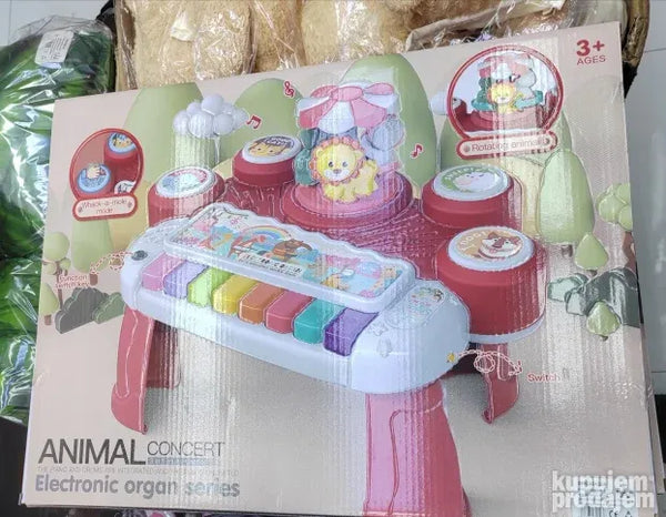 Укључите прекидач и нека забава почне са овом дивном играчком за учење. Анимал Цонцерт Орган-Ред је задивљујућа музичка играчка за вашег малишана. Овај 3 у 1 мултифункционални електронски оргуље има вишебојни тастер који пушта музику и звукове. Поред тога овај клавир има четири различита дугмета од којих свако ослобађа по један звук животиње пса овце мачке и слона. Такође има ротирајући сто који држи три животиње лава краву и слона. Овај клавир такође ослобађа 3Д ротирајуће светло и има тастер за прекидач функције. Проведите квалитетно забавно време са својим дететом и повећајте његову слушну способност побољшајте координацију руку и очију и повећајте његову интелигенцију. Потребне су три батерије величине 15 В АА.