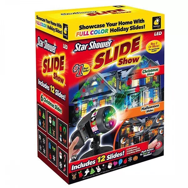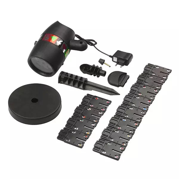 Set sadrži 12 slajdova sa po 4 različita motiva – jednostavno, odaberite željene motive, adapter laserskog projektora priključite u struju i sočivo lasera koje se okreće projektovaće animacije u boji koje ce pretvoriti vašu kuću, stan ili drvo u pravu senzaciju.