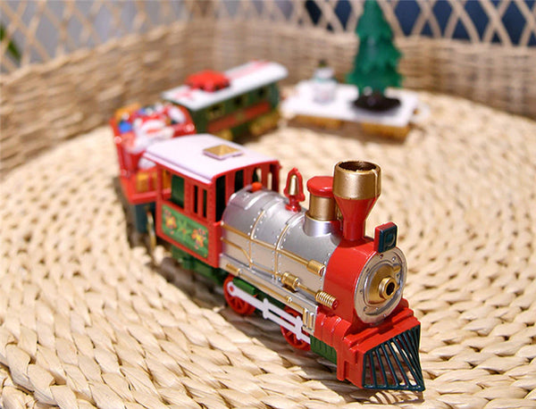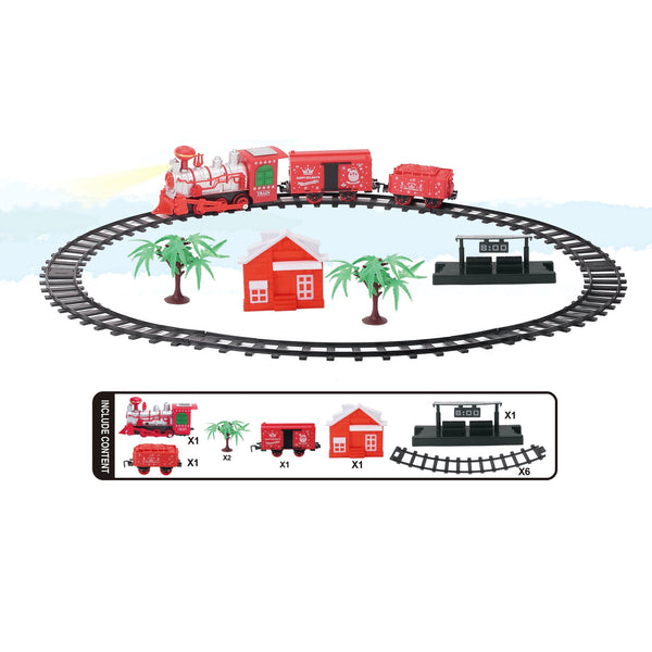 1 lokomotiva, 2 vagona, 2 drveta, 6 delova pruge, 1 kućica, 1 železnička stanica
