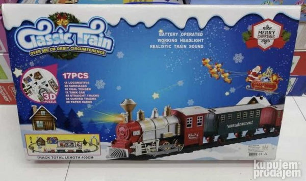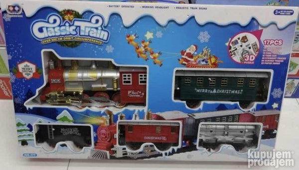 Novogodišnji vozić sa vagonima šinama i novogodišnjim dodacima. Zvični efekti realistični zvuk voza. Sastoji se od 17 delova. Uključuje 3D puzlePruga: 420cmZa rad potrebne 2AA baterije.