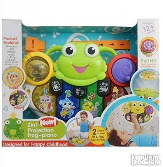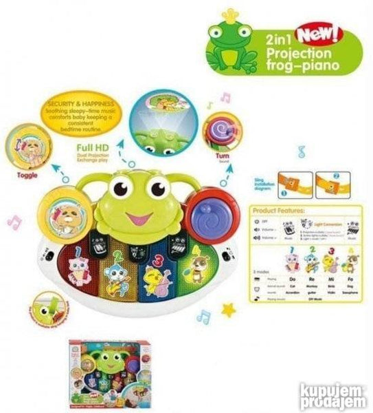 Umirujuca opustajuca muzika pozitivno utice na bebu. Sviranje zvukova i zvukova zivotinja - Macija harmonika majmunska gitara ptica violina pas saksofon. Na vrhu ima i dva mini projektora koji bebi skrecu paznju i zabavljaju je.