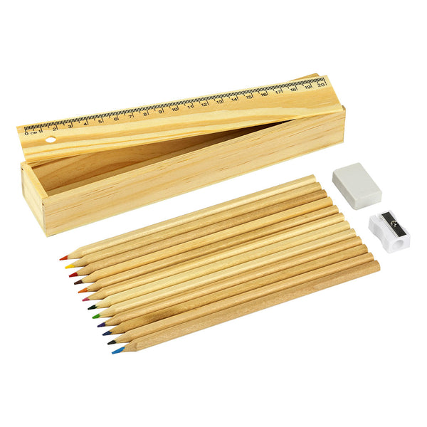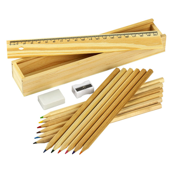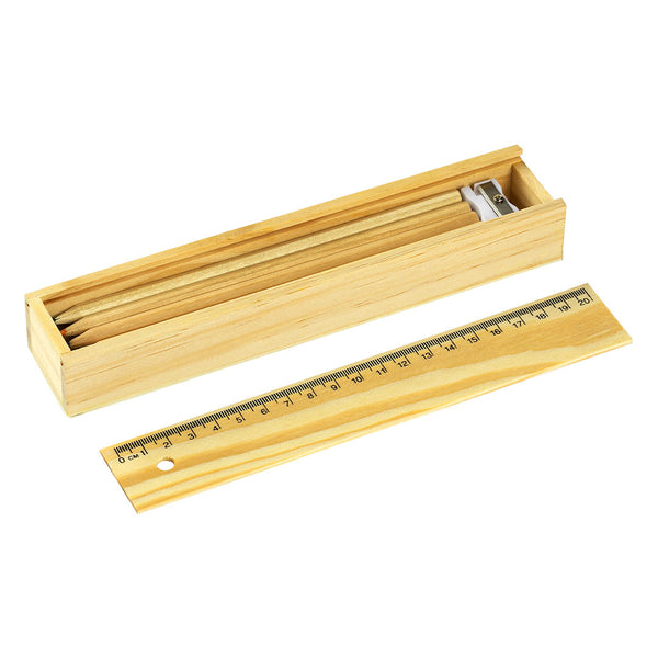 Drvene bojice sa zarezačem i lenjirom u drvenoj kutiji
