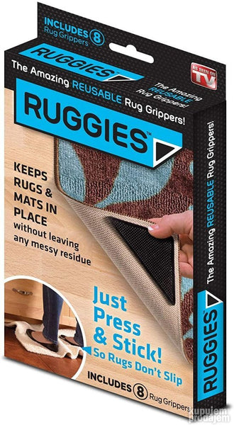 Ruggies čičak držači tepiha rade na jednostavnom principu: samo skinite zaštitnu foliju pre lepljenja i pričvrstite jedan od njih čvrsto i uredno na svaki ugao tepiha. Pravilno izvedena procedura će omogućiti da se premaz prestane pomerati sa predviđenog mesta ne možete se spotaknuti o njega ne plašiti se pada tokom vožnje što je posebno važno ako u kući ima male dece ili starijih rođaka.