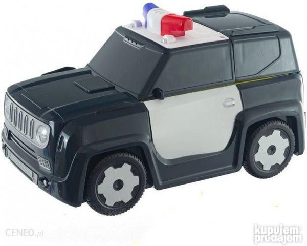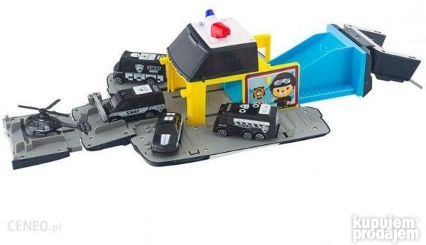 Policijski automobil igračka koja se pretvara u policijski parking sa lanserom za automobile. Garaža ima centralnu nagnutu rampu za ubrzavanje vozila. Veliko vozilo ima inercijski pogon Set sadrži: - veliki automobil koji se pretvara u parking - 4 mala metalna automobila - 1 helikopter - znakovi upozorenja okretnica - nalepnice - Melodije zvuci sirena bajke (eng. ) Dimenzije: Parking/garaža: 55 k 23 k 13 cm Vozilo: 23 k 13 k 13 cm Kutija: 30 k 15 k 14 cm