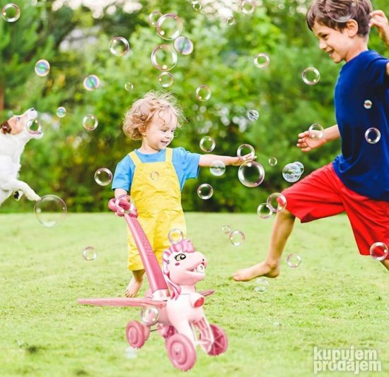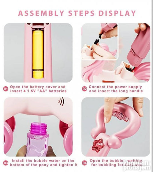 Očaravajuća Pony 3D mašina sa balončićima dečija guralica koja ima muziku i svetlo sa krilima koja lepršaju dok se kreće olakšava privlačenje pažnje dece. Možete uživati u mehurićima u slobodno vrijeme! Napravljen od izdržljivog i visokokvalitetnog netoksičnog materijala neće biti štetan za decu. Rastvor mehurića je blag i ne iritira oči lice i kožu dece. Jedinstven oblik dizajna mehurića mašine promoviše razvoj mašte i kreativnosti dece te je zabavna i interaktivna igračka koja će ih zabavljati satima. Igračka je dobra interaktivna igračka za roditelje i decu. Roditelji mogu da se igraju i komuniciraju sa decom kako bi poboljšali društvene sposobnosti dece. Igračka ima svetla na glavi repu i zvoncetu. Lako za upotrebu sapunica ima svoj pregradak na donjem delu igračke. Nakon što se ručka i krila sastave i rastvor se ponovo napuni samo treba da pritisnete dugme ON/OFF i tada će doći svet mehurića. Dolazi sa upustvom u 4 koraka. Dostupan u dve boje: roza i plava. U pakovanju uključene 2 boce sa mehurićima koncentrat sa mehurićima i uputstvo. Preporučeno za uzrast 3+. Ova guralica se napaja sa 4 AA baterije (nisu uključene). Dimenzije igračke: 22x11.5x40 cm
