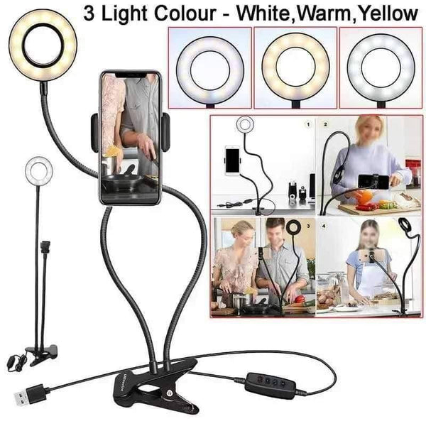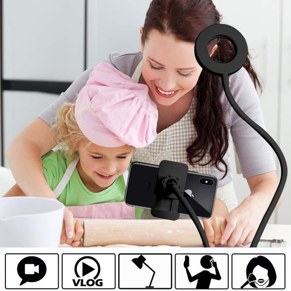 Prsten sa LED diodama po želji može svetleti intenzivno belim, žutim ili toplim žuto-belim svetlom. Savitljivi nastavci i jaka štipaljka za postavljanje pod idealnim uglom i na bilo koje mesto kako bi na jednostavan način snimili video materijal