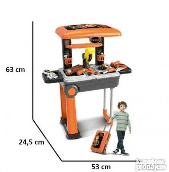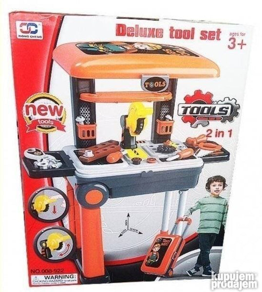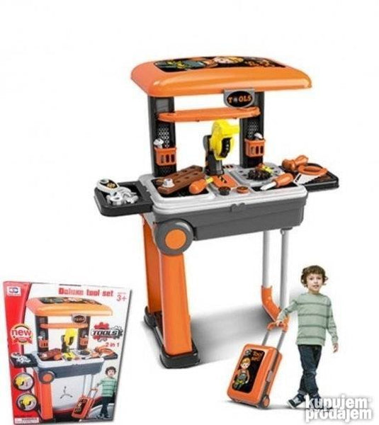2u1 Alat set radionica putni kofer nova serija setova alata za decu ovaj put smeštena u praktično pakovanje putnog kofera. Ovaj jedinstveni set alata iz putnog kofera na vrlo lak i jednostavan način može da se transformiše u alatni radni sto radionicu sa svim neophodnim alatima za male majstore. Sam set sadži veliki broj delova: brusilicu testeru francuski ključ šravcigere šrafove… Transformacijom alatnog stola u kofer štedite u prostoru jer je kofer malih dimenzija a praktičan je zbog svojih dimenzija za odlaganje. Takođe je praktičan za nošenje tako da dete svoju omiljenu igračku može da ponese bilo da je u gostima kod bake i deke nekih rodjaka ili kod nekog drugog.