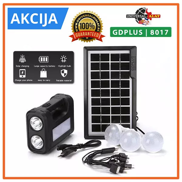 Multifunkcionalni sistem, lako prenosni sa solarnim panelom, baterijskom lampom, USB izlazima za punjenje mobilnih telefona.