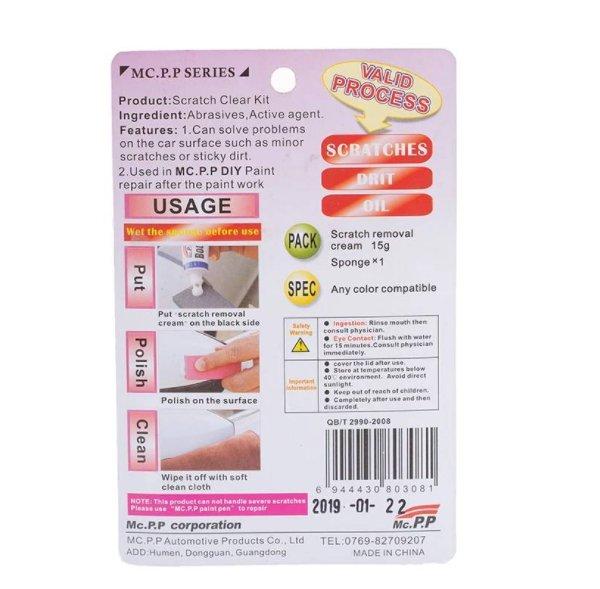 Pasta za uklanjanje ogrebotina dizajniran je tako da vraća originalni sjaj i boju. Svojim aktivnim sastavom eliminiše površinske ogrebotine, sastojci punila mogu brzo napuniti ogrebotine i tako popraviti oštećenja na boji. Lako uklanja oksidni film sa površine i tvrdokorna prljavština, mrlje od boje, ožiljci. Takođe egikasno vraća boju i sjaj laka.