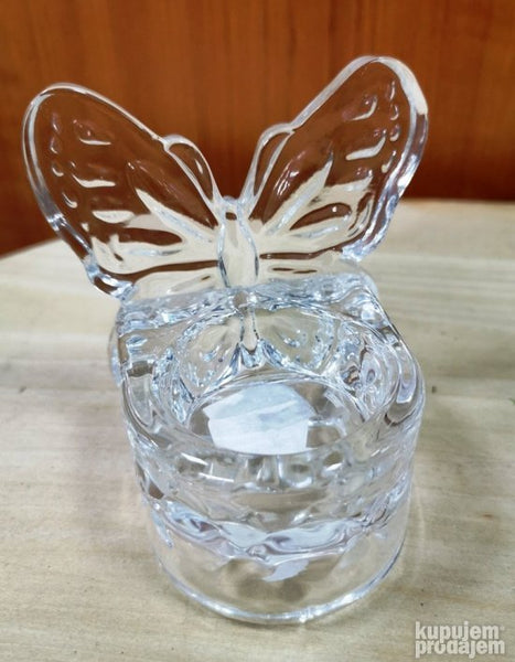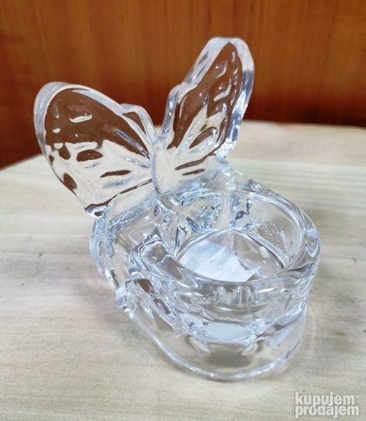 Prelepi stakleni svecnjak sa motivom leptira Dimenzije : Visina 9cm – Deo za svecu 5cm promer=======