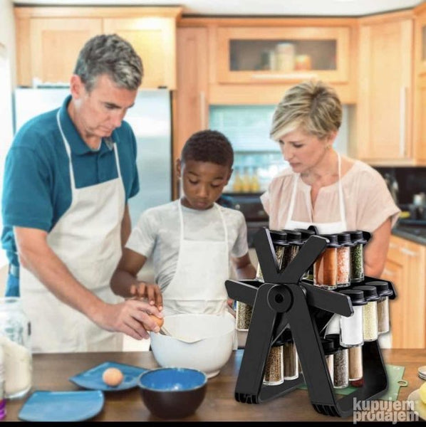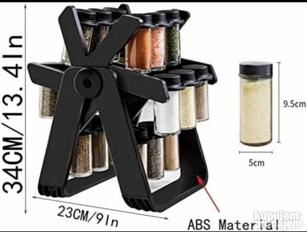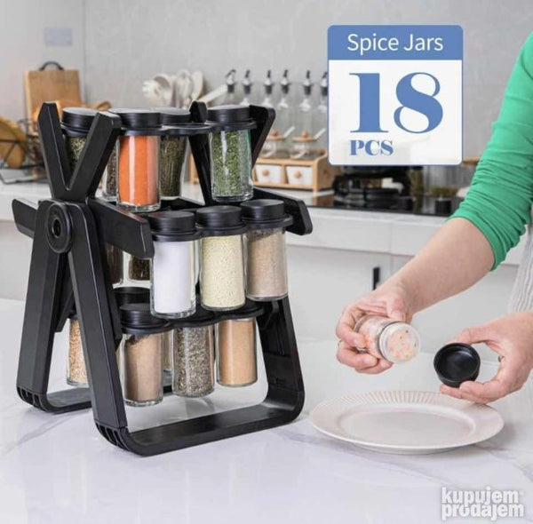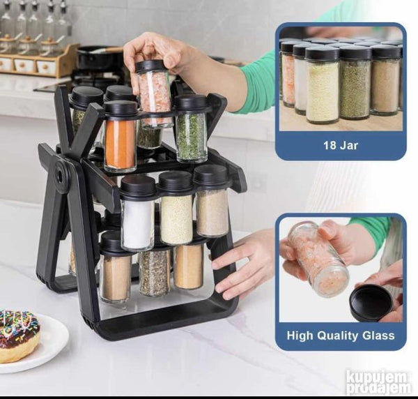 Stalak za začine sadrži 18 rezervoara za začine za svakodnevnu upotrebu soli bibera paprike karija i drugih začina (Napomena: začini nisu uključeni). Stalak za začine napravljen je od čvrstih materijala koji osiguravaju da može da stoji uspravno i stabilno u svakodnevnoj upotrebi i da se neće lako bacati.