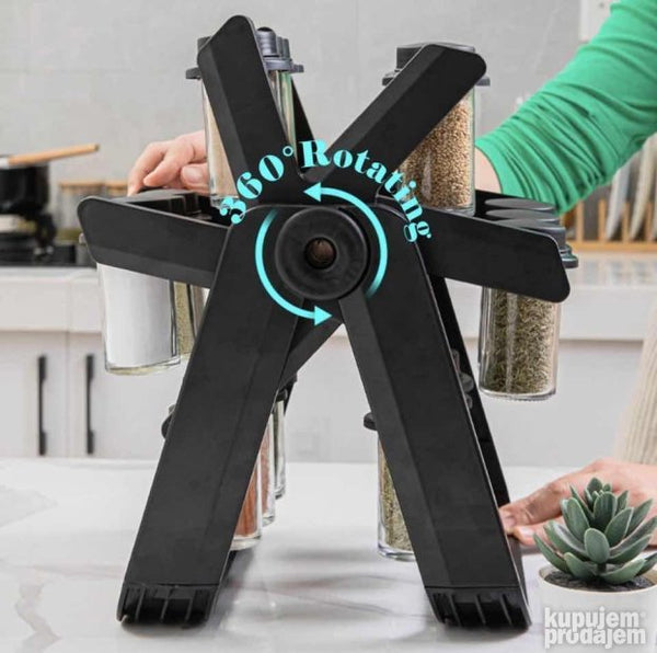 Karakteristike: Rotiranje za 360°: Kada ga koristite možete brzo da rotirate stalak za začine i pronađete teglu začina koja vam je potrebna. Veliki kapacitet: 18 komada bezolovnih staklenih tegli od 100 ml velikog prečnika za punjenje raznih začina. Ušteda prostora: Trodimenzionalna struktura ne zauzima prostor i pogodna je za male kuhinje. Koristan dizajn: Stabilnu osnovu postolja nije lako protresti. Materijal se ne lepi za ulje i lako se čisti. Jednostavan za upotrebu: Izlaz staklene tegle za začine je ujednačen i ne lepi se za začin što je lako za upotrebu.