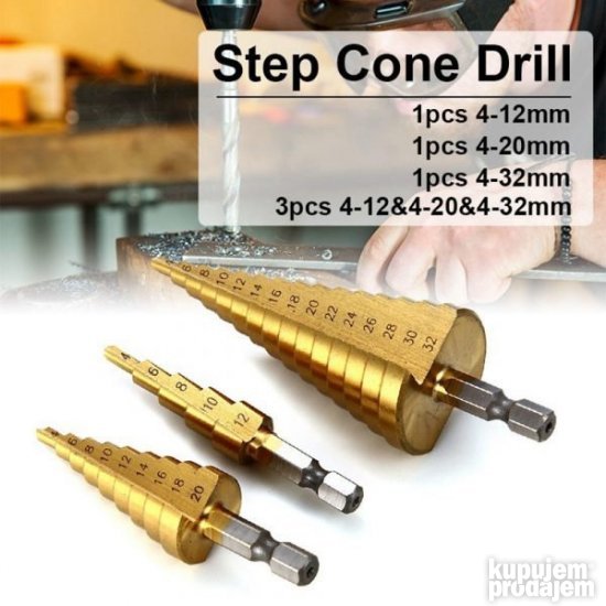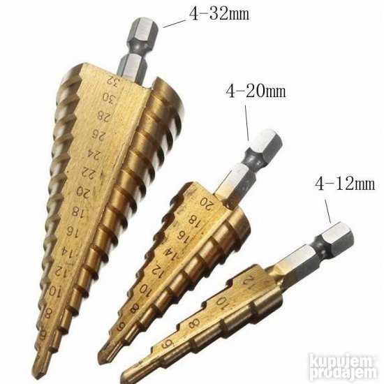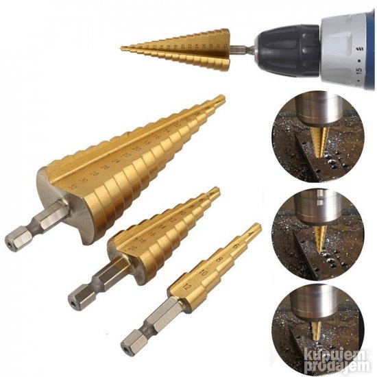 Stepenaste burgije od 3 komada set do 32mm Workzone Nov set od tri stepenaste burgije najveca precnika 32mm Za metal odlicnog kvaliteta potpuno novo.
