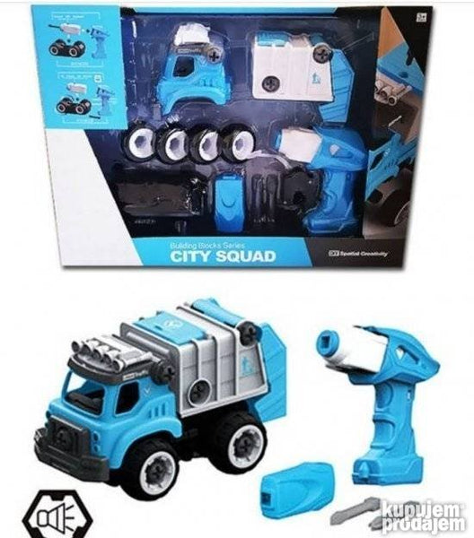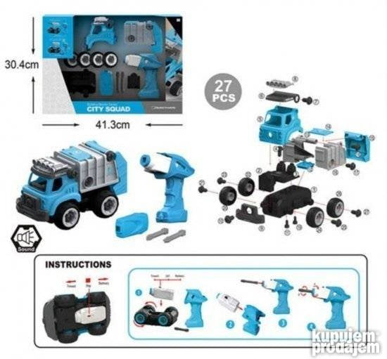 Kamion za odvoz otpada na daljinski odlican poklon za decu. Deca imaju alat i delove da sklope svoj omiljeni plavi kamion. A kada ga sklope kreće prava zabava. Kamion ima svoj daljinki upravljač u obliku džojstika sa kojim upravljate kamionom. Kada se završi sa igrom kamion se opet može rasklopiti i spakovati u delovima u kutiju.