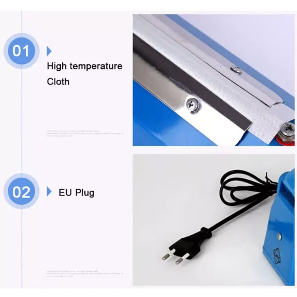 Napon: 220V Dužina vara: 400mm Širina vara: 2mm Impulsno varenje 1 komad rezervni grejač ide u kompletu U ponudi takodje imamo: Varilica za kese 400mm-3500 300mm-2500din 200mm-2000din