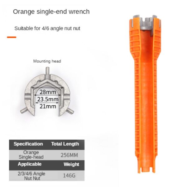 Alat s dvostrukom glavom. Prošireni dizajn omogućava vam okretanje teško dostupnih montažnih matica na slavinama, prskalicama i kugličnim dizalicama. Sadrži laganu plastičnu konstrukciju visoke čvrstoće i izdržljive aluminijske umetke. Drška protiv klizanja, jednostavna za korištenje. Izrađen od plastičnog materijala visoke čvrstoće, vrlo izdržljiv za upotrebu.