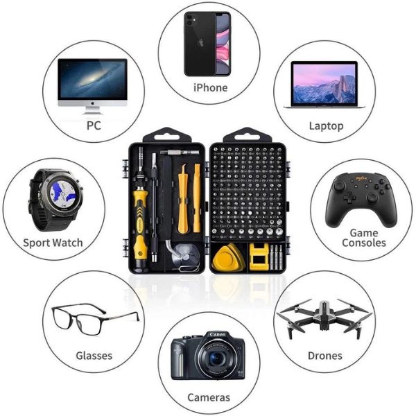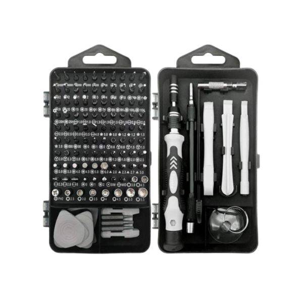 - Komplet šrafcigera 122 u 1 uključuje 98 bitova, 3TorkTR nastavke za odvijanje, 1 magnetizovanu dršku, 1 magnetizator/demagnetizator, 1 fleksibilnu produžetku osovinu, 1 šestougaonu utičnicu za baterijske bušilice, 1 plastičnu držačicu za zaštitu od statičnog elektriciteta 2, 3 ultra-tanak i 6 normalnih trouglastih alata za hvatanje, 1 magnetni jastučić sa mikro zavrtnjem, 1 igla za SIM karticu i 1 vakuumska čaša.