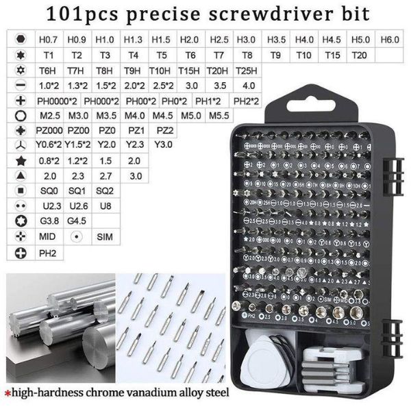 - Ovaj mali set preciznih odvijača sastoji se od 98 bitova za odvijanje, koji su napravljeni od Cr-V čelika (tvrdoća 55HRC) i 3 Tort bita za odvijanje, koji su napravljeni od legiranog čelika S2 (tvrdoća 60HRC)