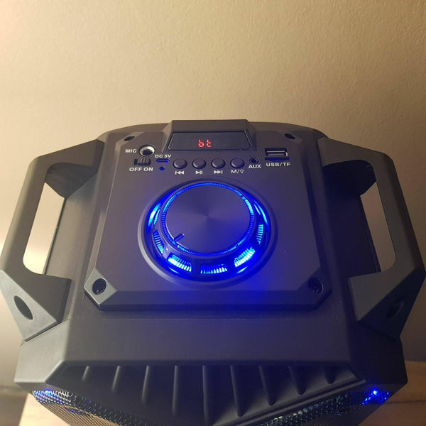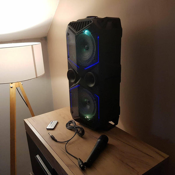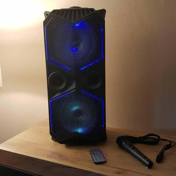 Odlican model prenosivog blutut zvucnika. Zvučnik je povećih dimenzija, ima sa prednje strane dva velika zvučnika. Možete ga kontrolisati preko daljinskog ili direktnim komandama koje se nalaze na zvučniku. Od funkcija ima FM radio, podršku za usb, sd karticu, priključak za mikrofon (mikrofon dobijate u setu). Povezuje se veoma lako preko bluetooth-a sa telefonom i ostalim uređajima.