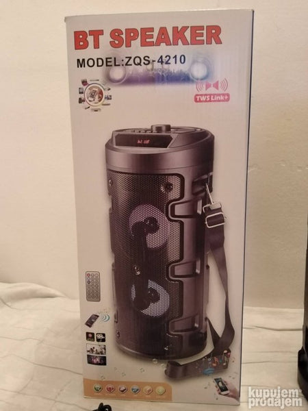 Zvucnik bluetooth Model ZQS - 4210 Boja crna sa plavom Fm radio Tf card Usb Bluetooth Aux Led svetlo Zvucnik 2x4inca Snaga 12w Frekvencija 45Hz - 18Khz 50db Kapacitet baterije 1200mAh Voltaza DC 5V Mikrofon Treger za nosenje zvucnika Daljinski upravljac Usb kabal za punjenje